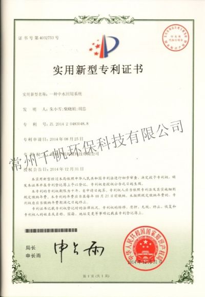實用新型專利證書 污水處理設(shè)備生化系統(tǒng)噴淋消泡裝置